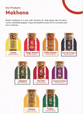 Leading Exporters, Wholesaler and Trader of Cheese Roasted Makhana, Chilly Cheese Roasted Makhana, Cream & Onion Roasted Makhana, Jalapeno Roasted Makhana, Lemon Roasted Makhana, Peri Peri Roasted Makhana, Pudina Roasted Makhana, Rock Salt & Pepper Roasted Makhana and Tangy Tomato Roasted Makhana from Gurugram.